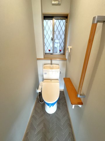 1階 洗浄機付きトイレ 携帯や本も置ける棚や手摺付き