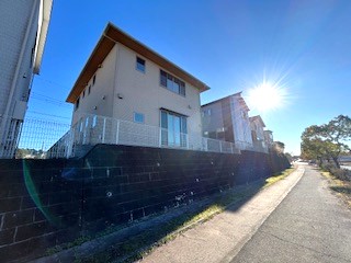 北西側からの外観 前面には田園風景が広がり、緑豊かな住環境です。北西側は高低差がある分、プライバシー性も高く、安心です。