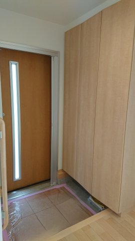 手摺付き、収納豊富な玄関です。玄関扉はスライドドアのため、ご年輩の方にも優しい造りとなっています。