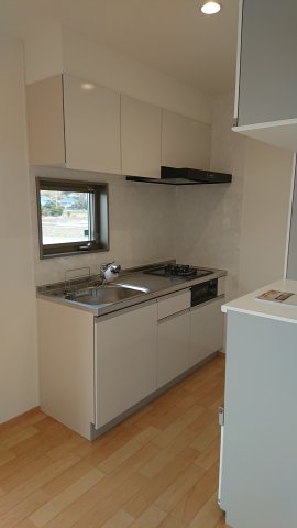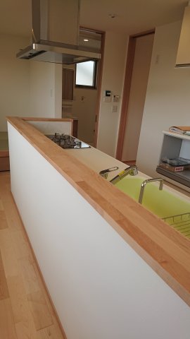 1階キッチン コンパクトサイズキッチンとなっており、2世帯でお住まいになられる際、ご両親が生活されるには、丁度よいサイズのキッチンです。