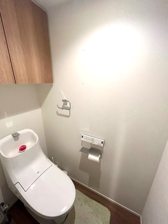 温水洗浄便座とお掃除もラクラクなフチレス便器を使用。トイレ吊戸棚はもちろんのこと、本やスマホを仮置きできるスペースを設置。