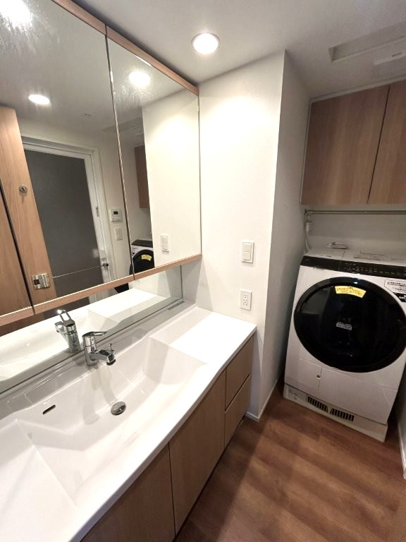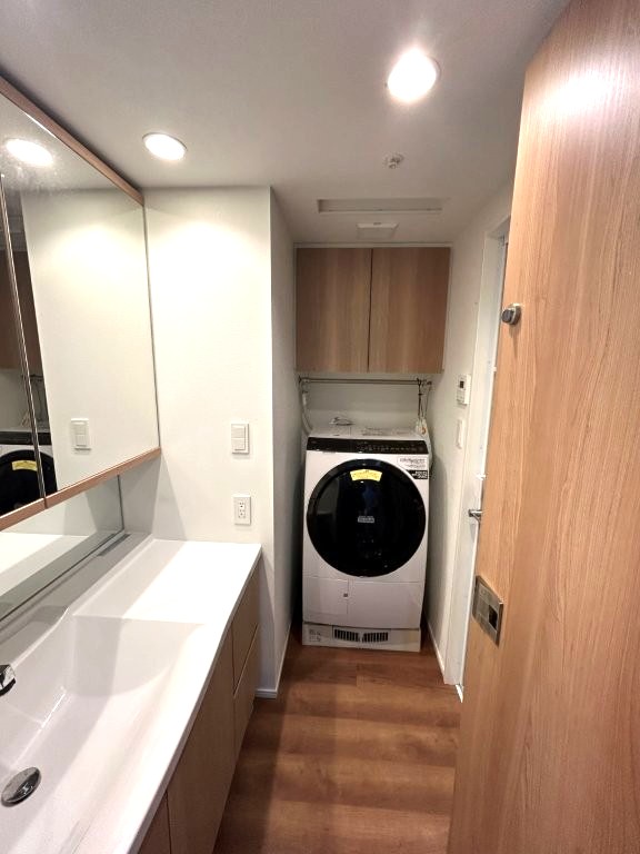 洗濯機上部には便利な吊戸棚。洗面台の下にはヘルスメータースペースも設けており、すっきりした印象を与えてくれます。